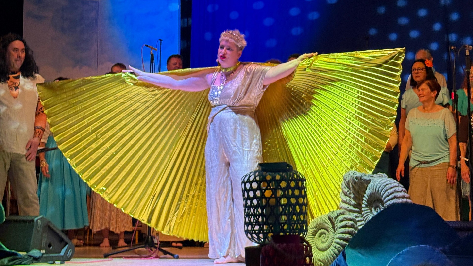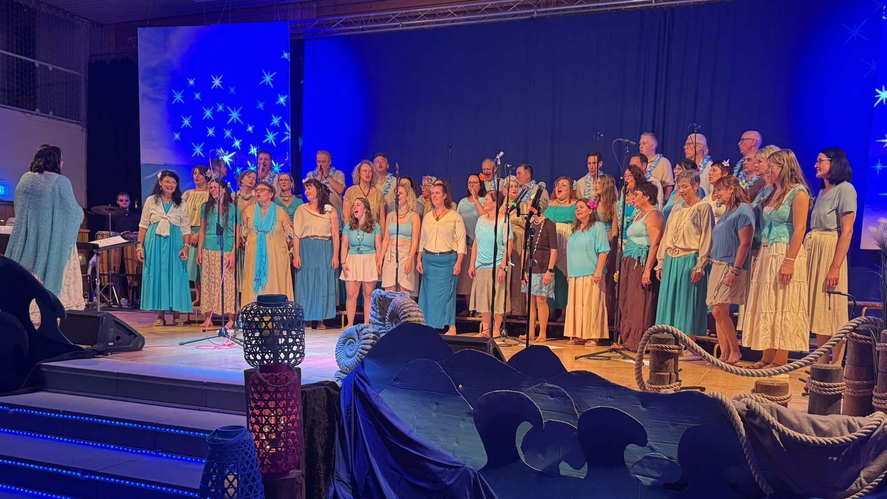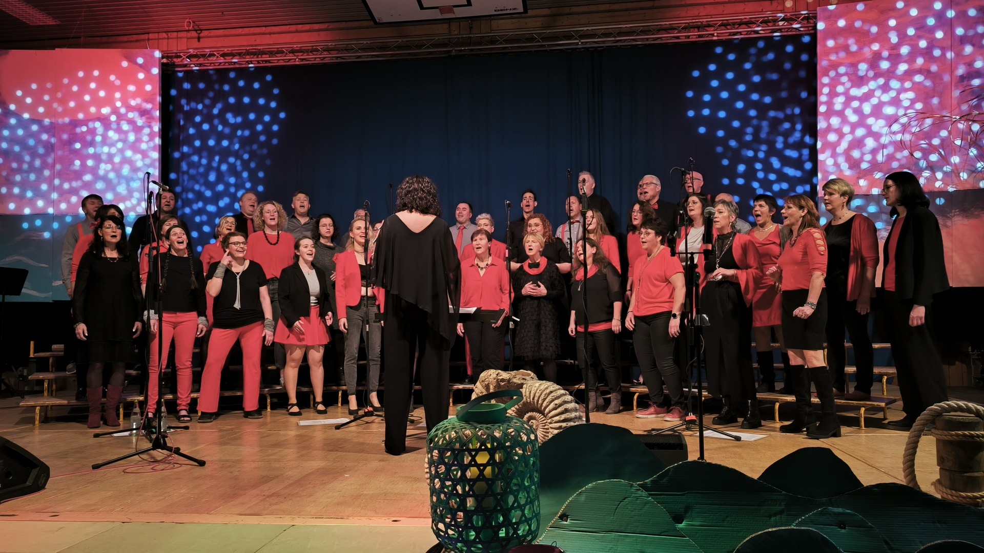 Nach der Pause folgte Teil 2 mit Auszügen der preisgekrönten Filmmusik aus dem Disney Film „Vaiana”. Dabei geht es um die 16-jährige Häuptlingstochter Vaiana, die trotz Verbots all ihren Mut zusammennimmt und ins offene Meer segelt, um ihr Volk zu retten. Gleich zu Beginn ließ der Chor mit den ersten Takten von «Tulou Tagaloa» polynesische Atmosphäre aufblühen. Spätestens bei «Ich bin bereit» hielt es die Zuhörer kaum noch auf den Sitzen. Das präzise Zusammenspiel der einzelnen Stimmen und Solisten/innen war nicht nur technisch beeindruckend, sondern verlieh der Geschichte in Einklang mit dem effektvollen Bühnenbild eine zusätzliche emotionale Tiefe. Hier führte Julia Zwiesler als Vaiana gekonnt und sympathisch durch’s Programm, so dass die Zuhörer auch der Geschichte folgen und in die Südsee-Welt eintauchen konnten. Herauszuheben ist dabei Dirigentin Karin „D’Cheffe” Schoch, die ihren Chor auf eine sehr motivierende Art und Weise führt und dabei noch einzelne Stücke selber arrangiert hat.