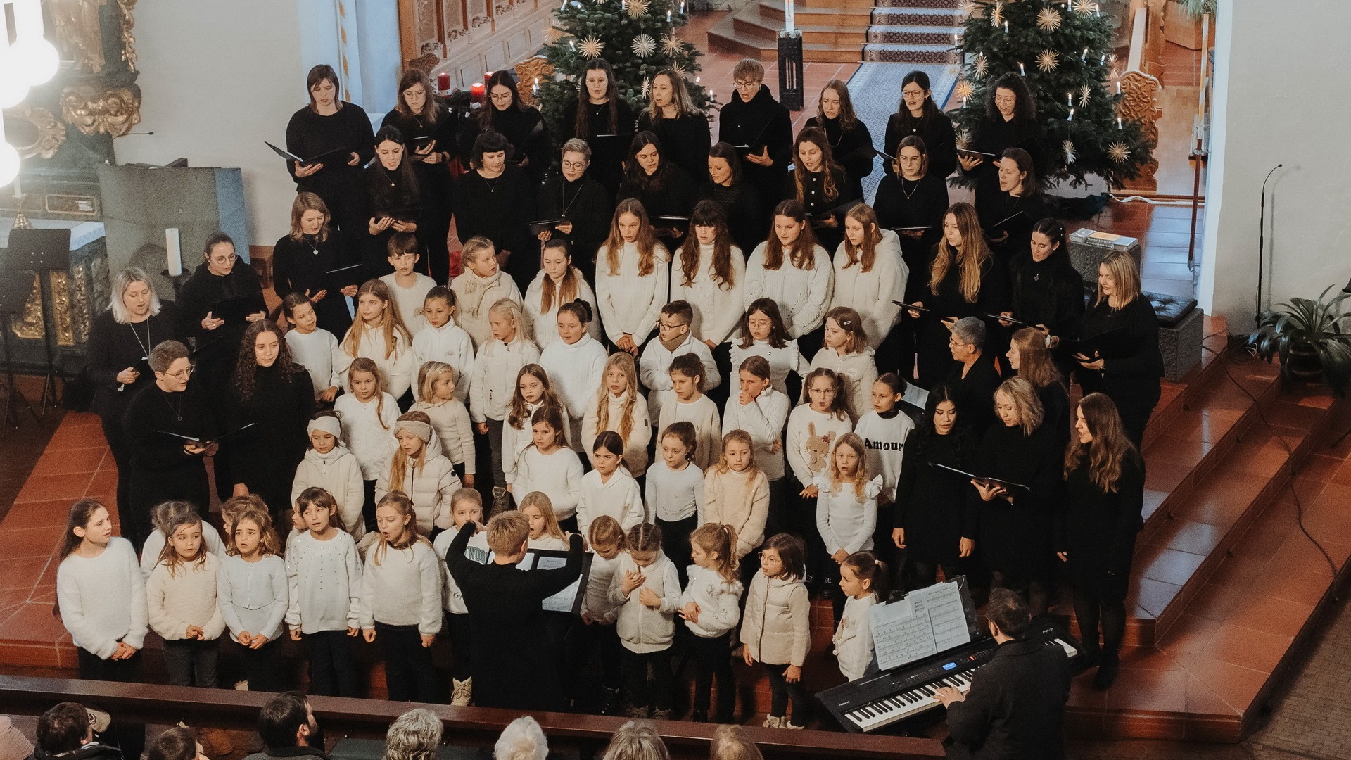Die KiChoLinis unter Leitung von Caroline Mast eröffneten mit «Dicke, rote Kerzen» das Konzert. Die versprühte Freude der jungen Künstler steckte die Konzertbesucher an. Der Chor begeisterte gestenreich mit den Liedern u. a. «O Weihnachtszeit» und «Ein guter Stern». Das stimmungsvolle Lied «Kleiner Weihnachtsstern» rundete den Chorvortrag ab. Beim «Mitten in der Nacht» erhielten die kinderhellen Stimmen Unterstützung durch die Crescentis, die sich während des Liedes zu den KiChoLinis stellten. Weiter war von beiden Chören der «Winter-Kanon» und «Mein allerschönster Weihnachtstraum» zu hören, welches teilweise solistisch aus den Reihen des Kinderchores untermalt wurde. Zu dem nachdenklichen «Immer Weihnachten» gesellte sich letztmals der gemischte Chor des Liederkranzes zu den zwei Chören und drei Generationen gaben zu verstehen: Wenn doch nur immer Weihnachten wär! Die Crescentis und der gemischte Chor trugen gemeinsam im Anschluss das «Weihnachts-Wiegenlied» und «So sanft und so leis» vor. Einfühlsam wurden alle Chöre am Piano von Johannes Tress begleitet.